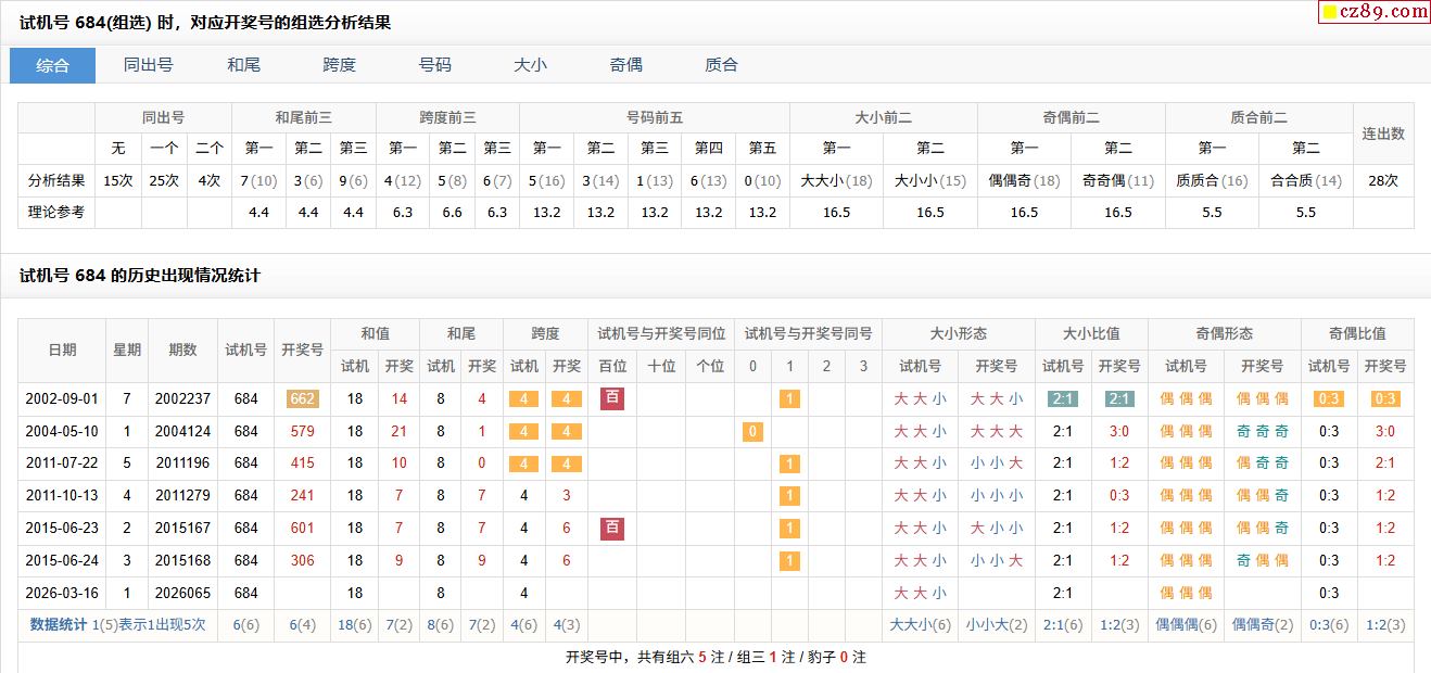 > 065期福彩3D试机号684对应开奖号的组选分析结果